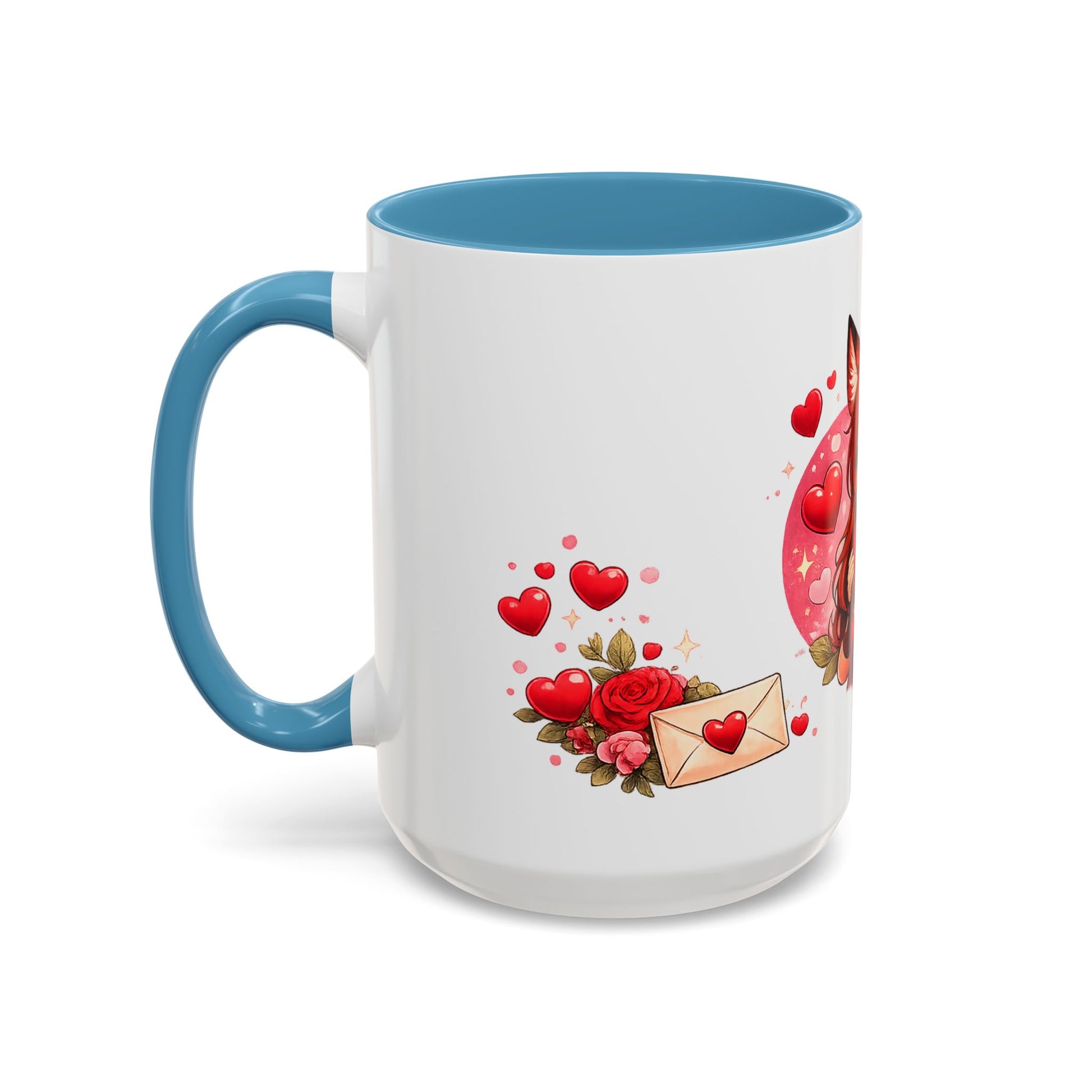 This adorable Fox Girl Valentine Accent Coffee Mug features a cute anime-style fox girl holding a heart, surrounded by romantic love letters, hearts, and roses. The colorful accent handle and interior perfectly complement the Valentine’s theme, making this mug both eye-catching and heartwarming.