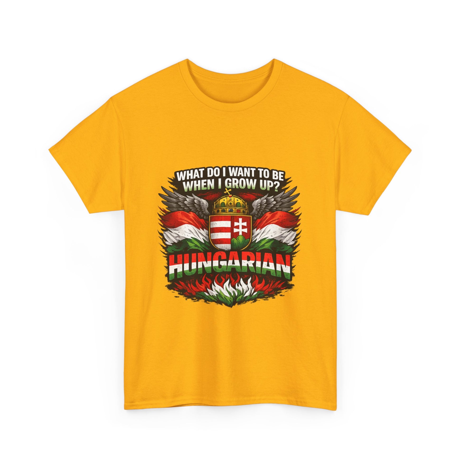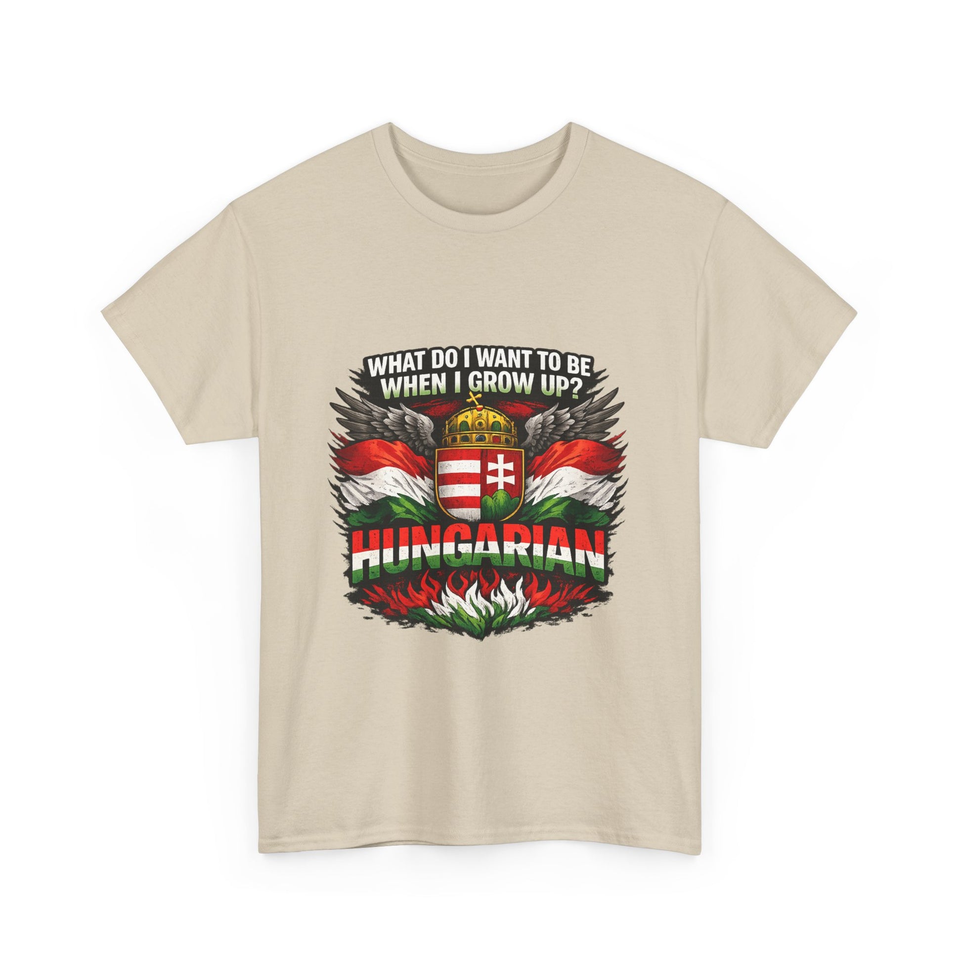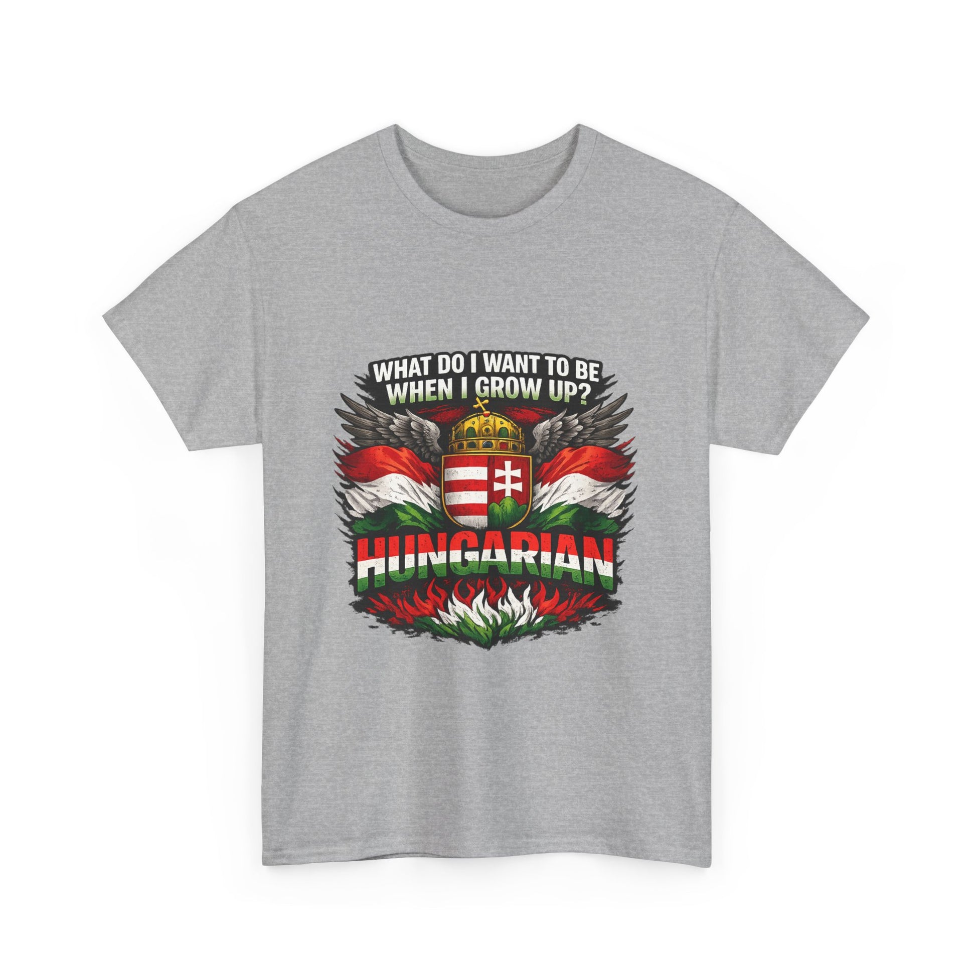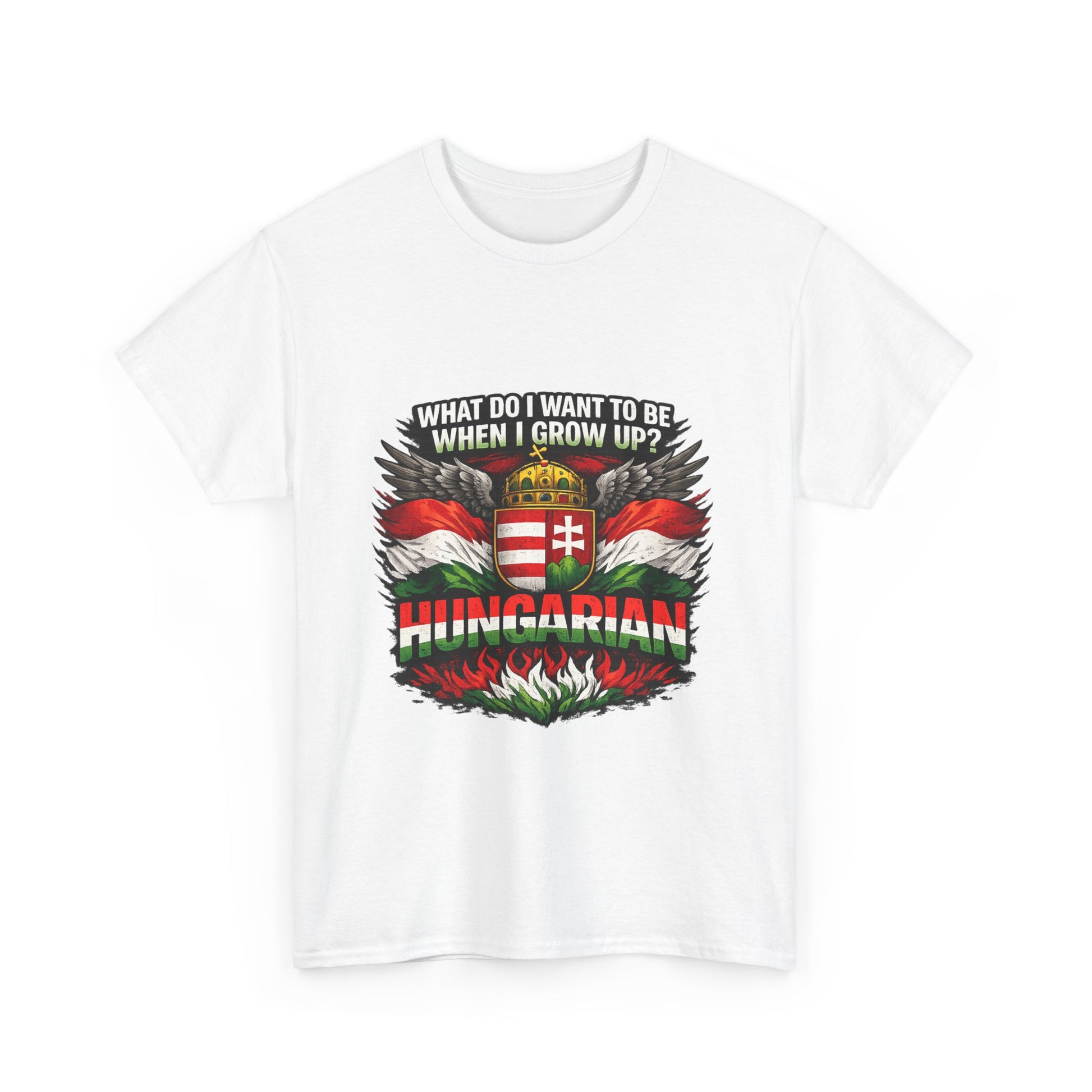What do I want to be when I grow up? Hungarian. This bold and powerful design is made for those who proudly carry their Hungarian identity wherever they go. Featuring strong national colors, iconic symbolism, and a confident statement, this t-shirt is more than clothing — it’s a declaration of heritage. Perfect for: Hungarians at home and abroad National holidays & cultural events Everyday wear with meaning Gifts for patriots, history lovers, and proud Hungarians 👕 Product Highlights ✔ High-contrast, print-ready artwork ✔ Centered design – looks great on all shirt colors ✔ Durable print suitable for everyday wear ✔ Unisex fit – comfortable and timeless ✔ Designed for bold self-expression 🎁 Great Gift Idea For Hungarians living abroad National Day celebrations Family members proud of their roots Anyone who believes identity matters Wear it with pride. 🇭🇺 Product features - 100% cotton solid colors; medium-weight 180 g/m² fabric for durable, year-round wear - Tubular knit construction with no side seams for cleaner look and reduced fabric waste - Ribbed knit collar and shoulder tape to retain shape and prevent stretching - Dual printing: DTF on sleeves/labels and DTG on main areas for crisp, detailed graphics - Tear-away label, Oeko-Tex certified, EU 2-year warranty; made in Nicaragua Care instructions - Non-chlorine: bleach as needed - Do not iron - Do not dryclean - Machine wash: cold (max 30C or 90F) - Tumble dry: low heat
