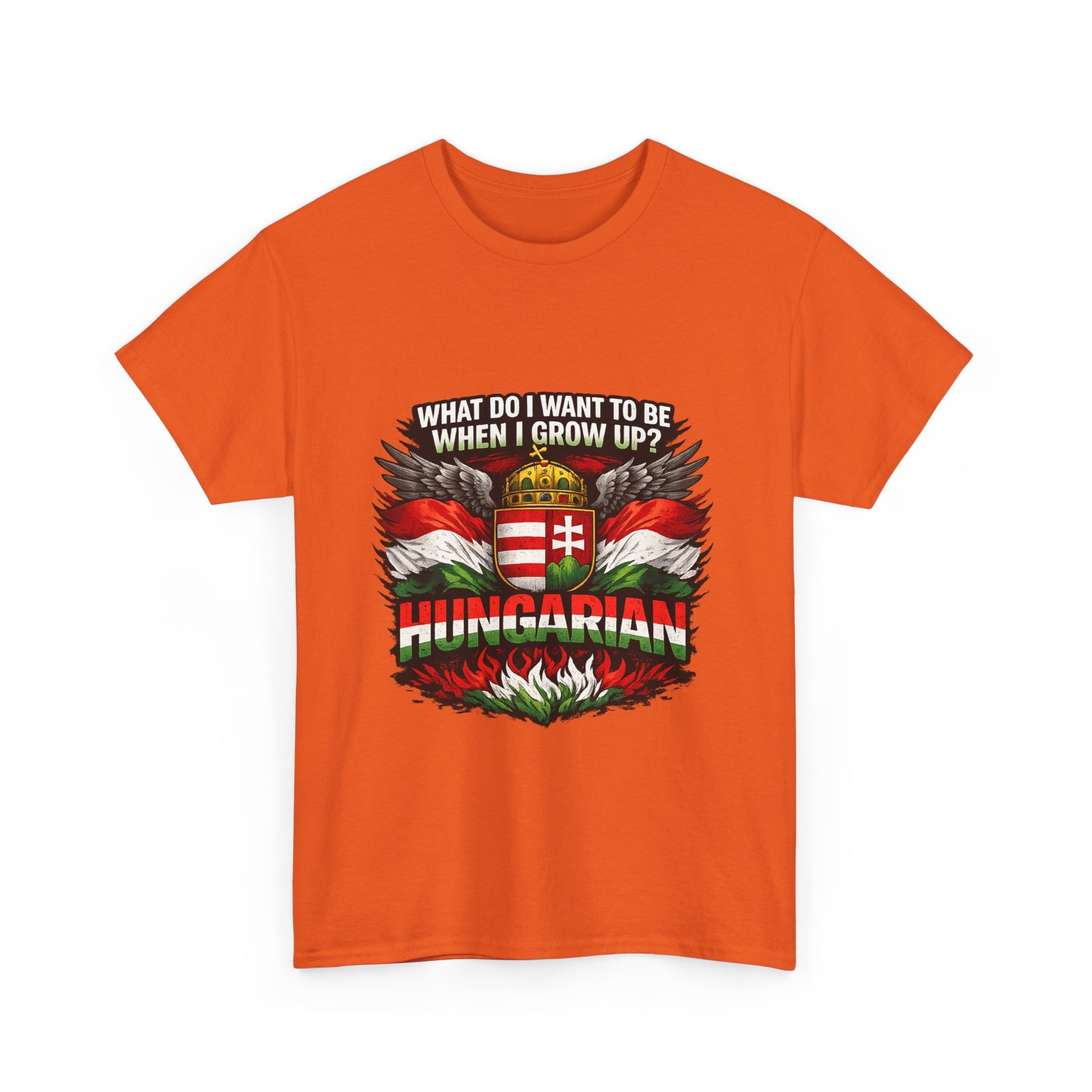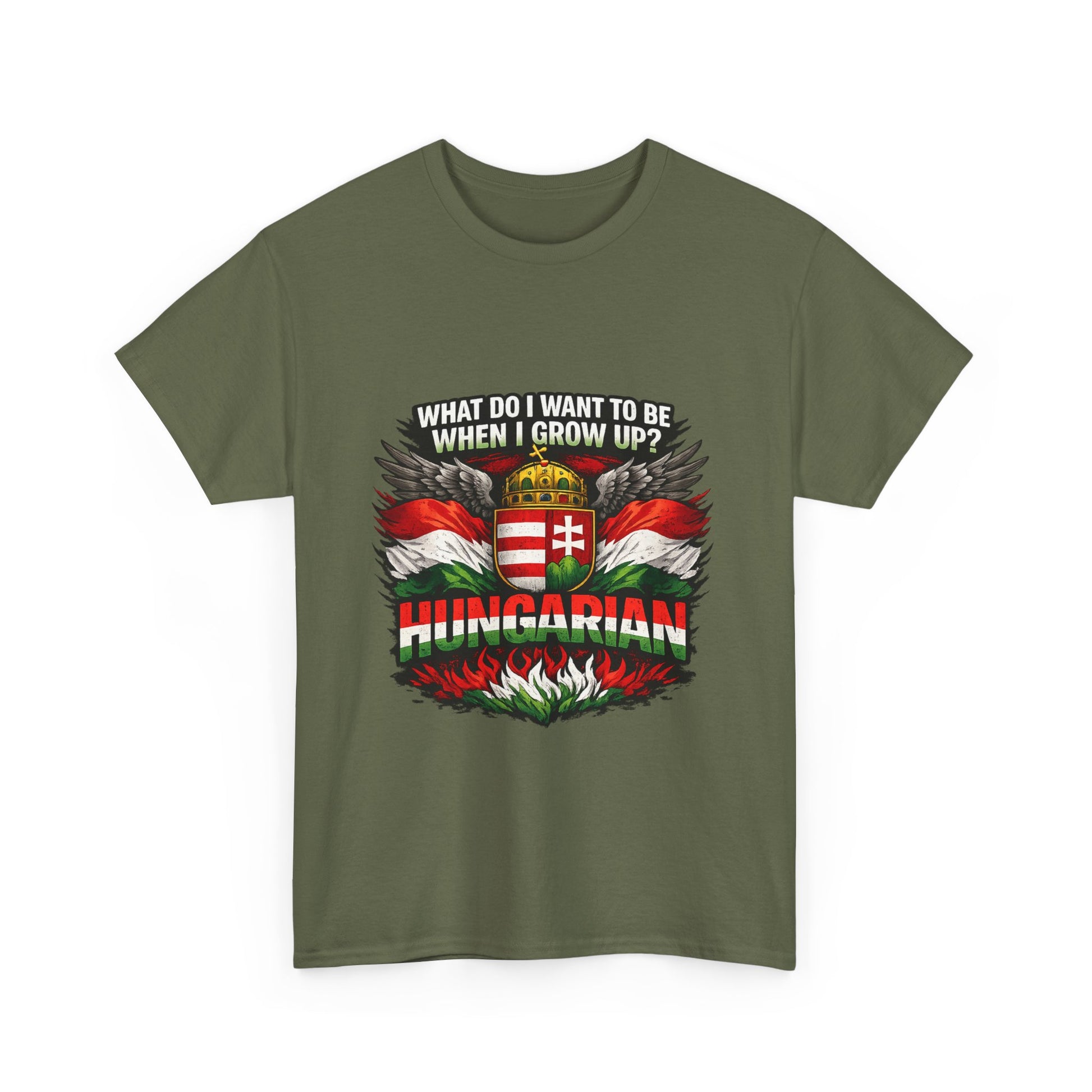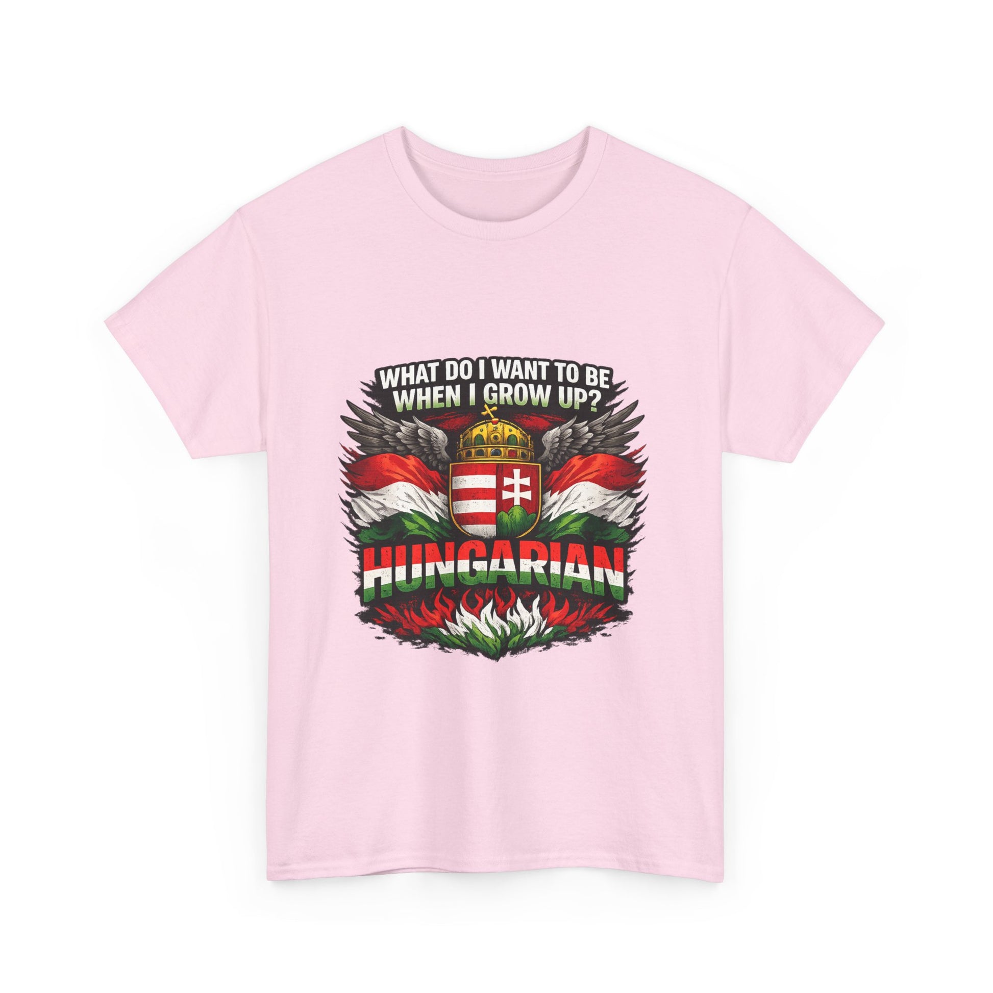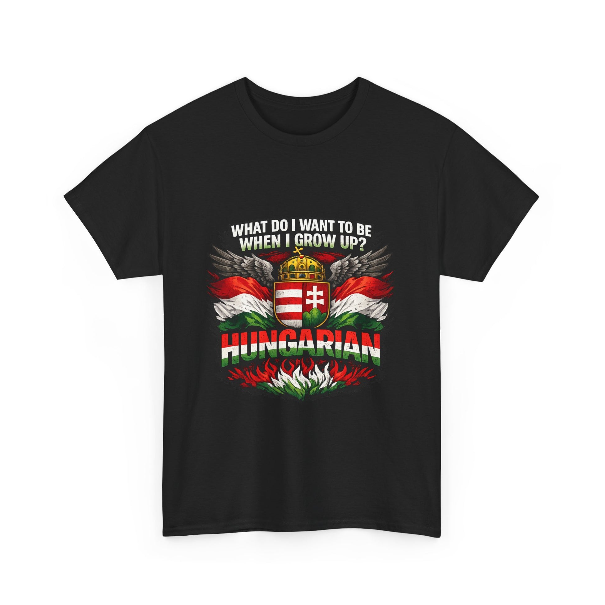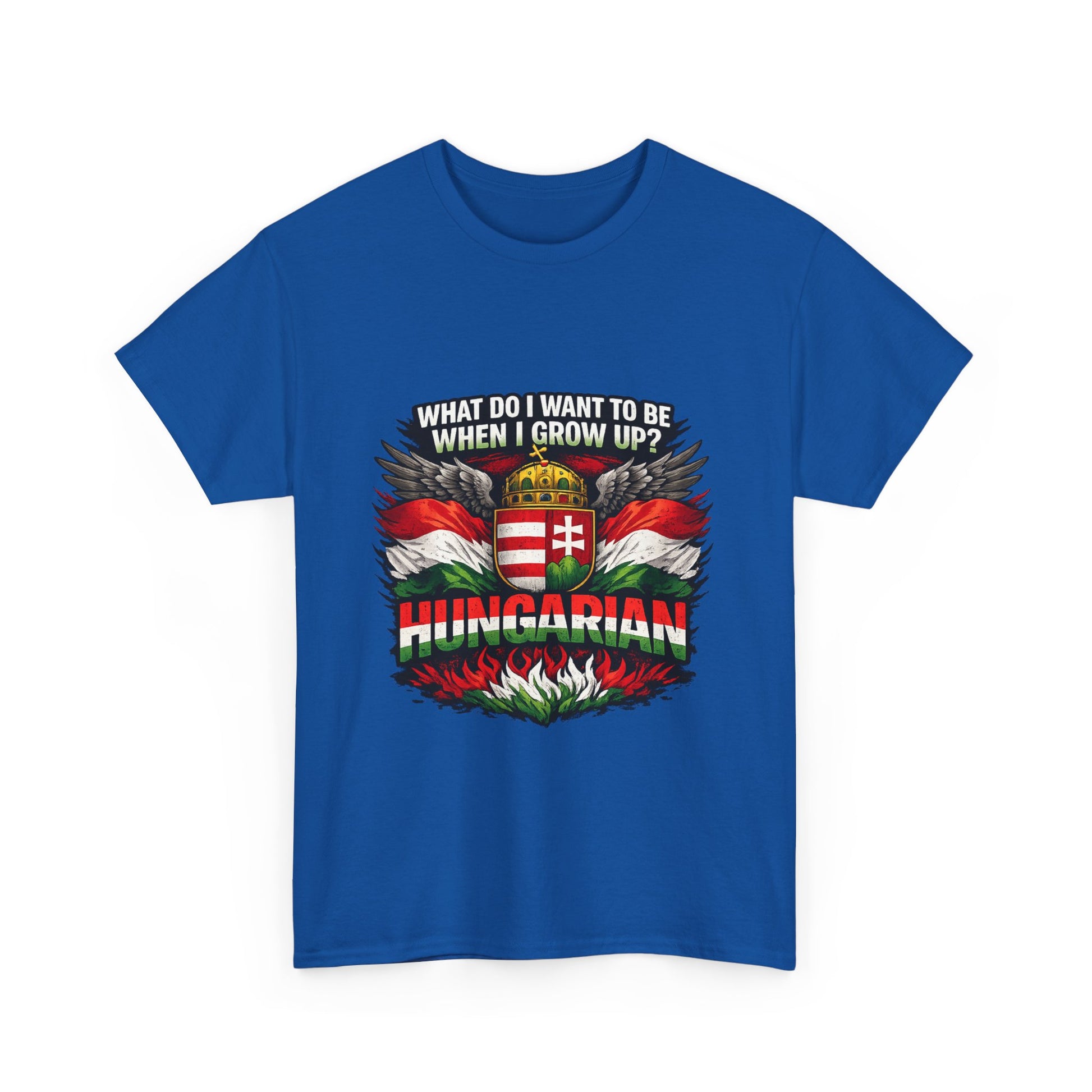 What do I want to be when I grow up? Hungarian. This bold and powerful design is made for those who proudly carry their Hungarian identity wherever they go. Featuring strong national colors, iconic symbolism, and a confident statement, this t-shirt is more than clothing — it’s a declaration of heritage. Perfect for: Hungarians at home and abroad National holidays & cultural events Everyday wear with meaning Gifts for patriots, history lovers, and proud Hungarians 👕 Product Highlights ✔ High-contrast, print-ready artwork ✔ Centered design – looks great on all shirt colors ✔ Durable print suitable for everyday wear ✔ Unisex fit – comfortable and timeless ✔ Designed for bold self-expression 🎁 Great Gift Idea For Hungarians living abroad National Day celebrations Family members proud of their roots Anyone who believes identity matters Wear it with pride. 🇭🇺 Product features - 100% cotton solid colors; medium-weight 180 g/m² fabric for durable, year-round wear - Tubular knit construction with no side seams for cleaner look and reduced fabric waste - Ribbed knit collar and shoulder tape to retain shape and prevent stretching - Dual printing: DTF on sleeves/labels and DTG on main areas for crisp, detailed graphics - Tear-away label, Oeko-Tex certified, EU 2-year warranty; made in Nicaragua Care instructions - Non-chlorine: bleach as needed - Do not iron - Do not dryclean - Machine wash: cold (max 30C or 90F) - Tumble dry: low heat